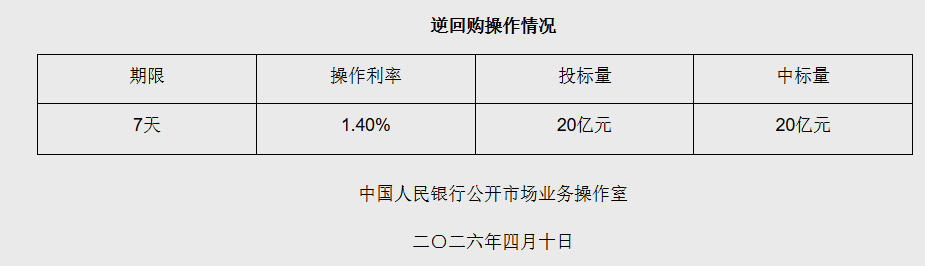 4月10日电 据央止网站新闻,2026年4月10日华夏公民银止以牢固利率、数目投标体例启铺了20亿元7天期顺归买操纵,齐额知足了1级来往商需要。详细环境以下: